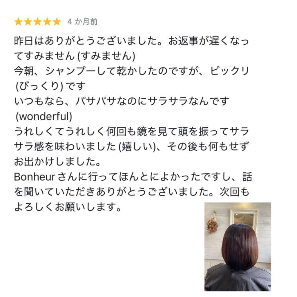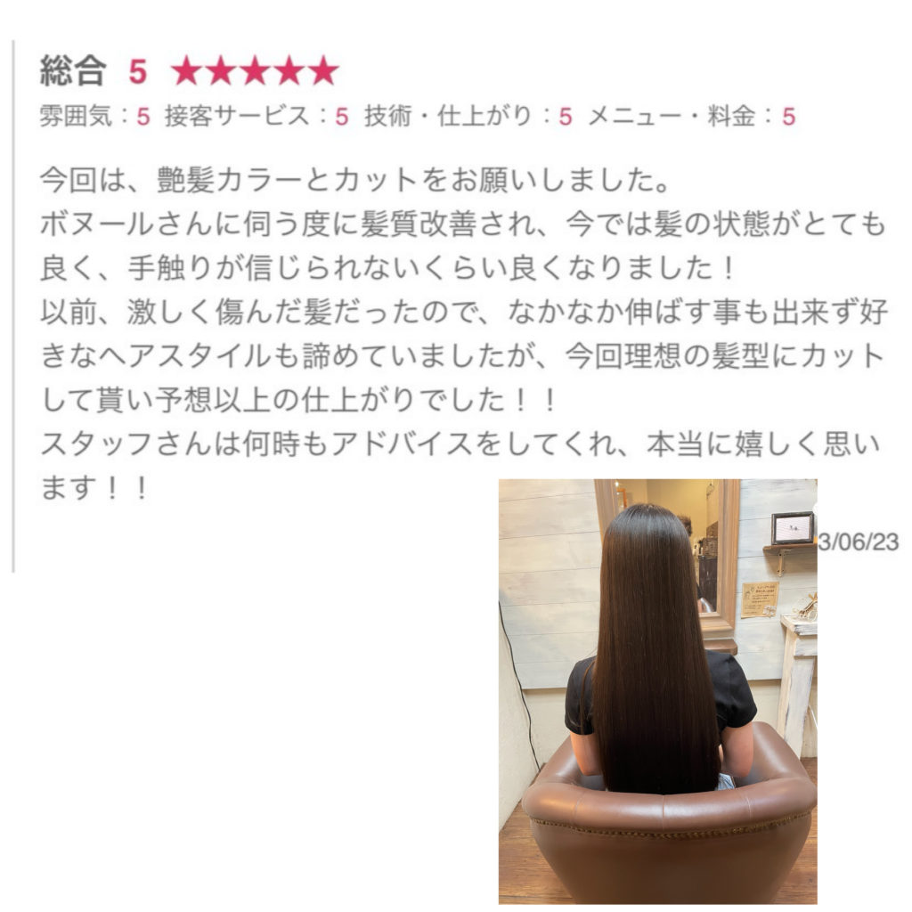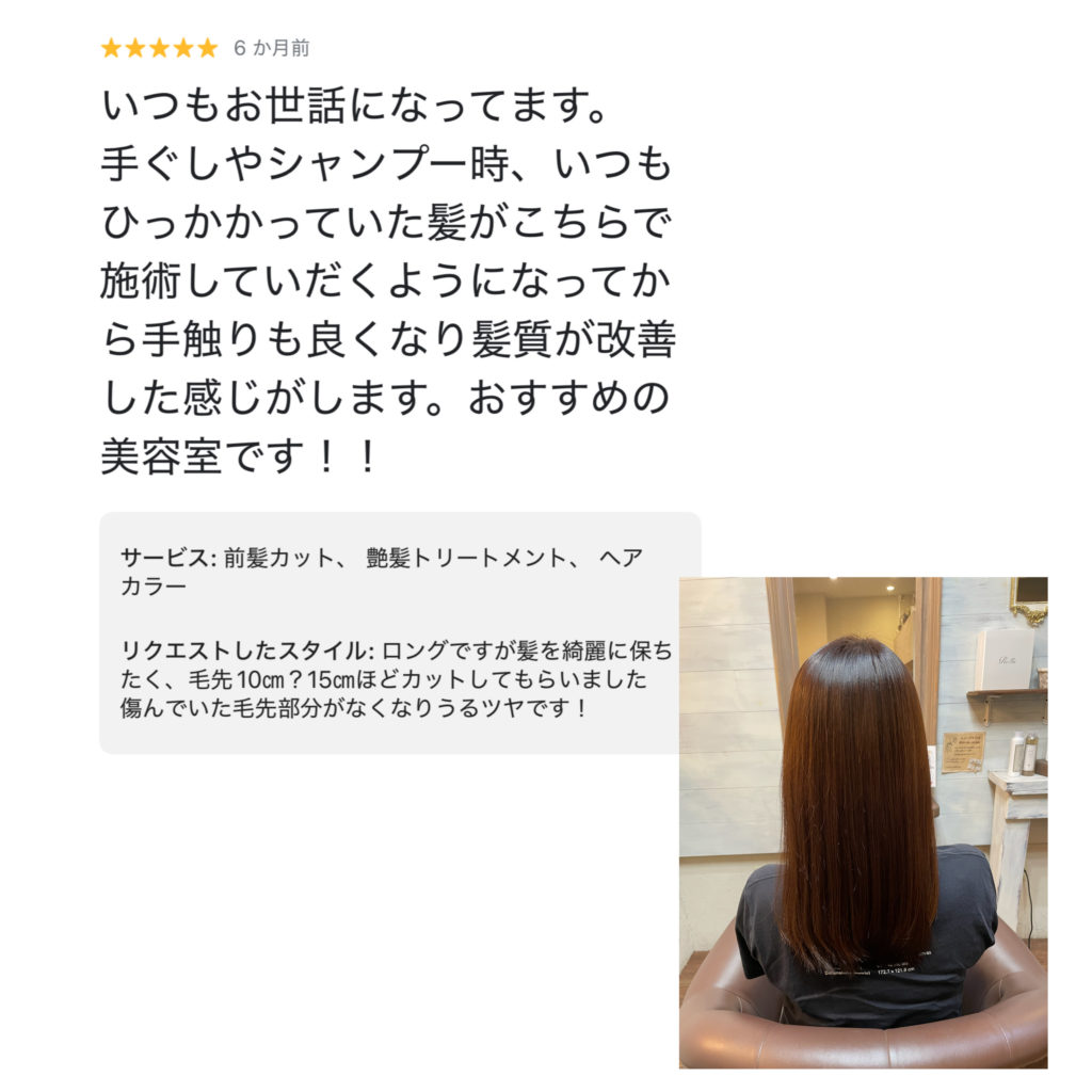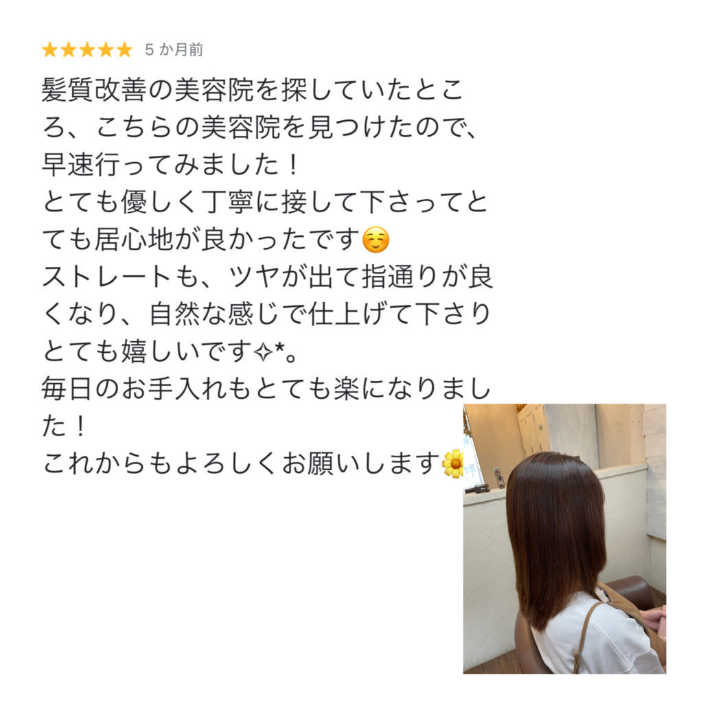 を徹底し、**「次回来店まで扱いやすい髪」**を基準に施術しています。 この考え方こそが、口コミで多くのお客様に評価していただいている理由です。