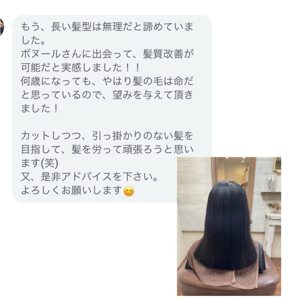 実はボヌールにご来店されるお客様の多くが、「今まで色々な美容室に行ったけど、どこも同じだった」そんな想いを抱えて来られています。 ✔ カラーやトリートメントをしてもすぐパサくつ ✔ その場は綺麗でも、1〜2週間で元に戻る✔ 年齢とともに髪質が変わってきた気がする